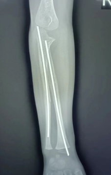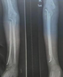 入院后我科于2023年08月17日下午在全身麻醉下行右侧尺挠骨骨折封闭复位+髓内针内固定术,术后第二天如下图示: